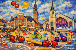 Het is zaterdagmiddag. De Grote Markt wordt schoongeveegd van de markt. Ze zijn getuige van het opnieuw opbouwen voor iets anders. Ze blijven het gadeslaan want ze zijn gewoon dat het marktplein dadelijk terug ingenomen wordt door parkerende auto’s. “Wat gebeurt er?” vragen ze aan een caféhouder. “Ah, nu komen de fruitige fietsjes voor de kinderen, is het antwoord; de namen van die gekke fietsen vind ik goed: Pom, Pwaar, Keez, Jaadbèrt; er is ook een Lachkriek en een Reinekloot.”