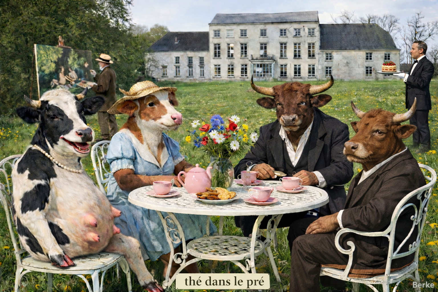 “En kijk deze, thé dans le pré, dat is een persiflage op le déjeuner sur l’herbe van Manet, denk ik, met het Speelhof op de achtergrond.”