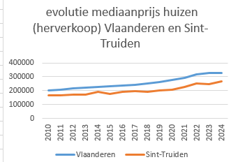 1° De mening is wijdverbreid dat er schaarste heerst op de woningmarkt. Uit het voorgaande blijkt dat dit niet strookt met de waarheid en zeker niet voor Sint-Truiden. Dit wordt ook gestaafd door het verloop van de prijzen van bestaande huizen en van bestaande appartementen in Vlaanderen en in Sint-Truiden. De prijs ligt telkens lager in Sint-Truiden dan in Vlaanderen. Dit is deels te verklaren doordat Sint-Truiden niet behoort tot het centrale deel van Vlaanderen waar ook hogere lonen betaald worden.