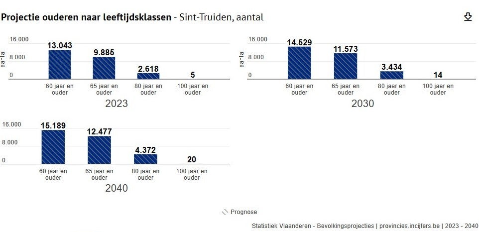 - De werkelijk bejaarde bevolking (80 +) zou in Sint-Truiden toenemen van 2.618 in 2023 tot 4.372 in 2040, d.i. met 1.754 personen (+ 67%).